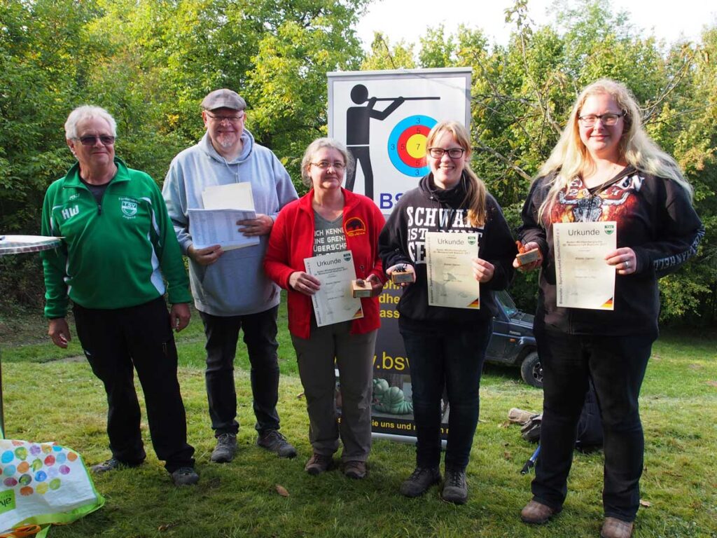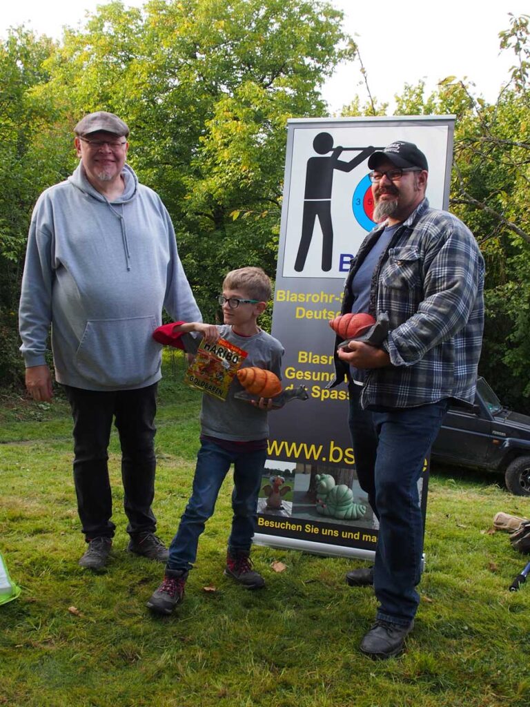 Tiiieef Luft holen und auf geht’s in die 3D Meisterschaften im Blasrohrschießen. Am Sonntag wurden in Rinklingen die 1. Baden-Württembergischen Meisterschaften im 3D Blasrohrschießen ausgetragen. Bei Kaiserwetter kamen insgesamt 38 Teilnehmer zusammen. Nachdem sich die Gruppen gebildet hatten, wurden diese auf dem extra für die Meisterschaft gestellten Parcours verteilt. Zeitgleich durften die Teilnehmer mit der Drei-Pfeil-Runde beginnen und sich durch den Parcours mit 14 Stationen arbeiten. Einheimische Tierattrappen sollten aus Entfernungen von zwischen 5 und 25 Metern getroffen werden. Ob Käuzchen, Rebhühner, Waschbären, Iltis oder Biber, es wurde eine vielseitige und knifflige Aufgabe. In der Mittagspause wurde ein Tombolaschießen veranstaltet. Hier konnte jeder einen Dart auf eine Spielkarte schießen. Wessen Gegenstück aus einem identischen Kartenspiel gezogen wurde, hatte gewonnen. Die Preise, 3D Ziele in Schneckenform, wurden vom Blasrohrsport Verband Deutschland e.V. gesponsored. Anschließend wurde die zweite Runde eingeleitet, in der eine Hunterrunde geschossen wurde (ein Pfeil je Ziel). Am Ende hatte bei den Schülern Hannah Jung die beste Puste und erlangte mit 329 Punkten Platz eins! Bei den Herren errang Michel Speth Gold. Für den TSV Rinklingen konnte Achim Jung mit 486 Punkten Bronze holen. Dicht gefolgt von Gerhard Kühner auf Platz vier. Bei den Damen wurde Chantal Lohmeyer Erste. (Rinklingen JB)