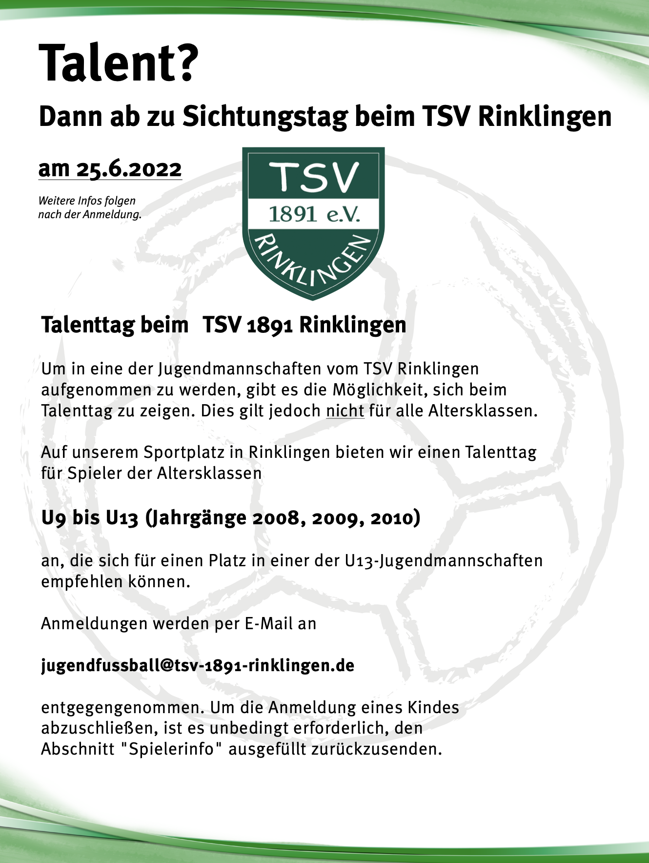 Um in eine der Jugendmannschaften v om TSV Rinklingen aufgenommen zu werden, gibt es die Möglichkeit, sich beim Talenttag zu zeigen. Dies gilt jedoch nicht für alle Altersklassen.